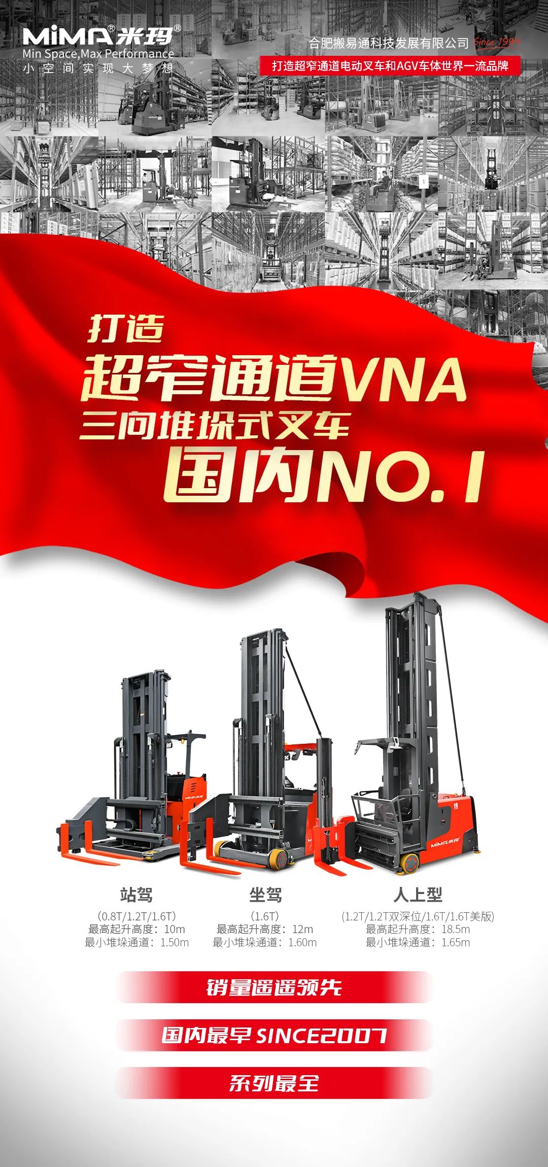 合肥搬易通(MiMA米瑪)是國產(chǎn)品牌中首家設計研發(fā)并批量銷售超窄通道三向堆垛車的企業(yè),也是國內取證最早,應用案例最多的企業(yè)之一。2023年,成為《中華人民共和國機械行業(yè)標準-三向堆垛式叉車》標準參編單位,擁有三向堆垛式叉車相關技術專利40余項。同時,憑借超3000臺的交付業(yè)績和不斷拓展的海內外市場,MiMA已成為超窄通道叉車領域一流企業(yè),擁有豐富的實踐經(jīng)驗,無論是極端環(huán)境作業(yè)需求,還是客戶對空間利用、安全保障的高要求,MiMA都能通過專業(yè)定制化方案助力企業(yè)實現(xiàn)倉儲升級。