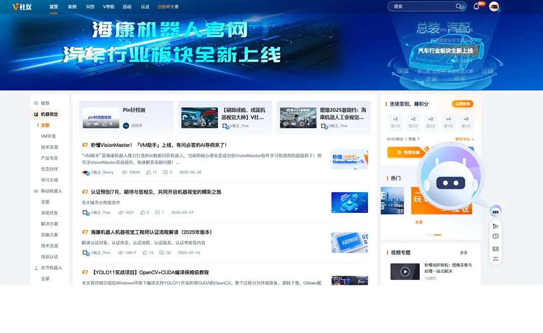 “小V智能助手”是??禉C器人專為機器視覺(MV)和移動機器人(AMR)用戶傾力打造的AI問答機器人,核心使命是成為工業(yè)人專屬的軟硬件學習和使用的“超級搭子”!它可以:零門檻提問打開V社區(qū)首頁注...