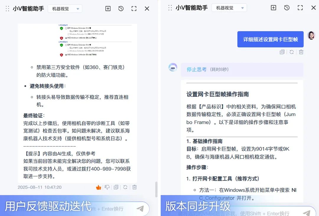 小V并非“憑空想象”,它的智慧基于通用大模型,數(shù)據(jù)來源于??禉C器人多年積累的垂直領(lǐng)域知識庫,被完整“投喂”平臺全版本文檔、用戶手冊及技術(shù)白皮書,確?;卮鹋c官方標準一致,為用戶提供專業(yè)、及時的回復。