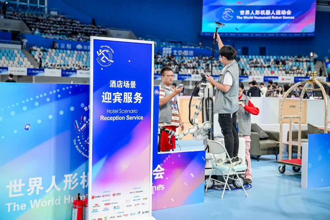 在酒店迎賓賽事中,上海交通大學數(shù)字山海戰(zhàn)隊使用松靈分體式ALOHA(移動雙臂升降具身平臺),展現(xiàn)了機器人在服務(wù)場景中的智能化與移動性能,為未來酒店迎賓提供了技術(shù)參考。