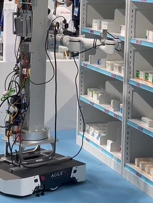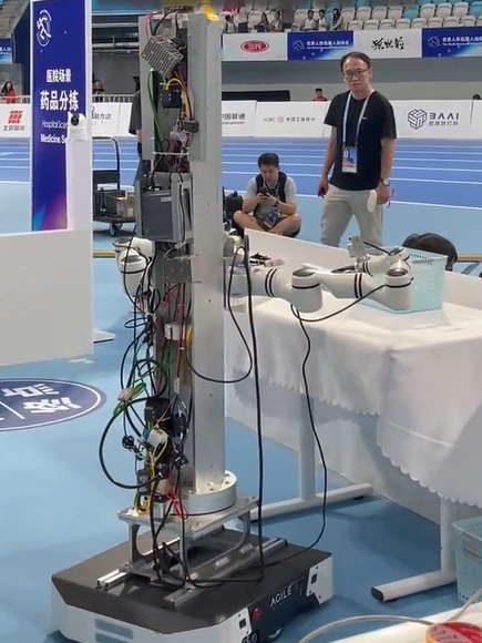 除了以上戰(zhàn)隊,新訊智能參與醫(yī)院場景-藥品分揀賽道,使用搭載松靈輕量六軸PiPER雙臂的移動升降具身平臺,機器人需根據(jù)處方精準取藥,機械手需具備0.1毫米級抓取精度。
