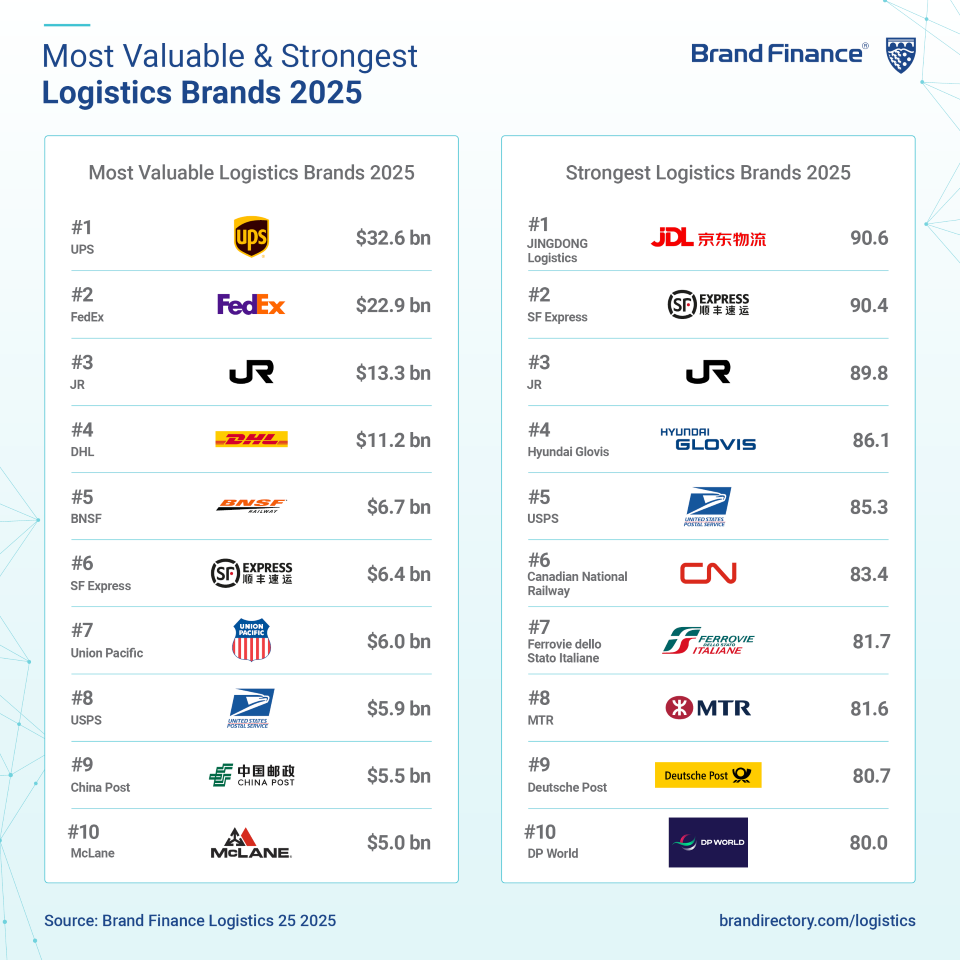 Brand Finance 的最新數(shù)據(jù)顯示,隨著數(shù)字化轉(zhuǎn)型和電子商務(wù)繼續(xù)重塑物流行業(yè),全球物流品牌價(jià)值到 2025 年將達(dá)到 1680 億美元。