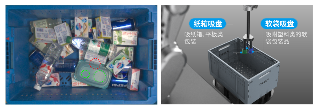 極智嘉的首個(gè)通用機(jī)械臂操作技術(shù)方案,專為解決這一難題而來。它通過多目相機(jī)捕捉高精度 3D 環(huán)境信息,結(jié)合系統(tǒng)訂單信息,通過 Geek+ Brain 模型完成智能揀選工作:精準(zhǔn)分割物品并識(shí)別材質(zhì)特征,推理生成完整 3D 信息和空間定位,進(jìn)而判斷最優(yōu)抓取點(diǎn),智能決策末端執(zhí)行器的吸盤選擇和機(jī)械臂運(yùn)動(dòng)軌跡,穩(wěn)穩(wěn)完成智能擺放。