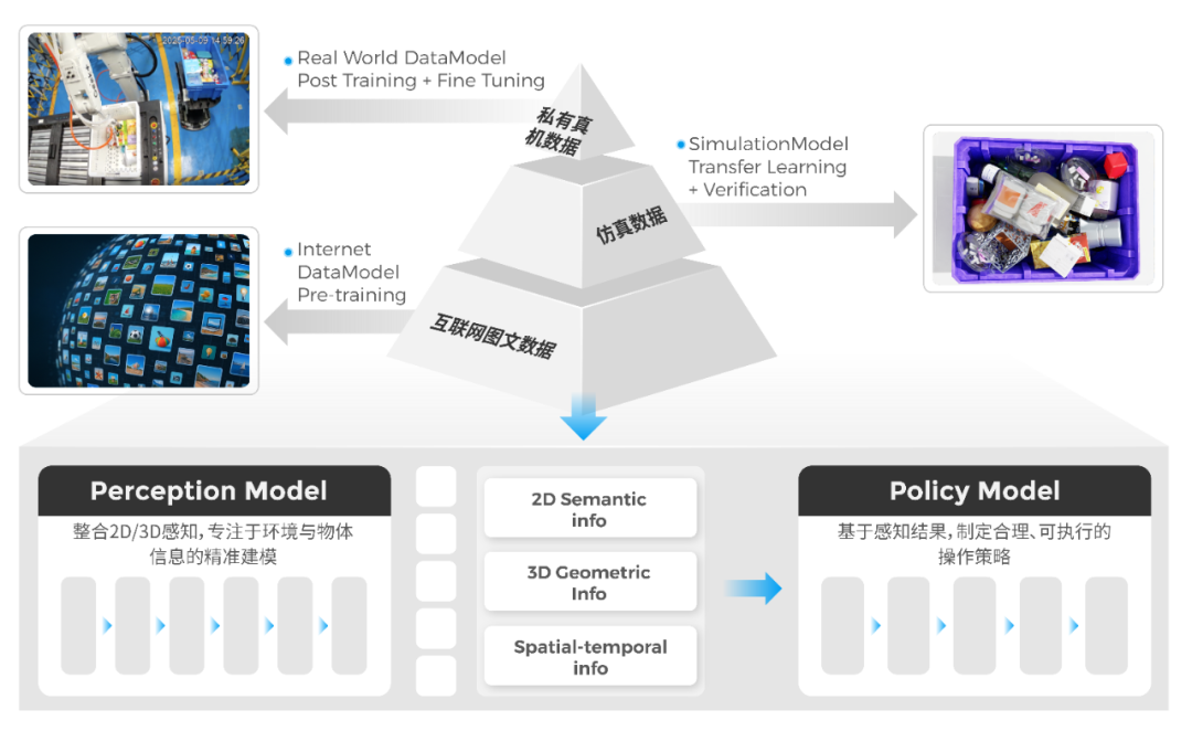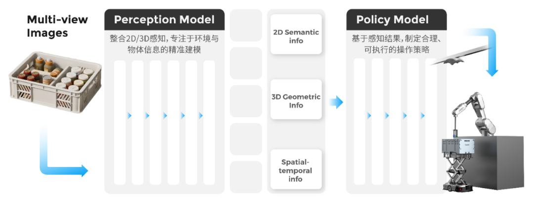 極智嘉的具身智能基座模型 Geek+ Brain 采用 “感知-策略”兩段式分層架構(gòu),由 Perception Model(感知模型) 與 Policy Model(策略模型) 兩個(gè)核心層組成。