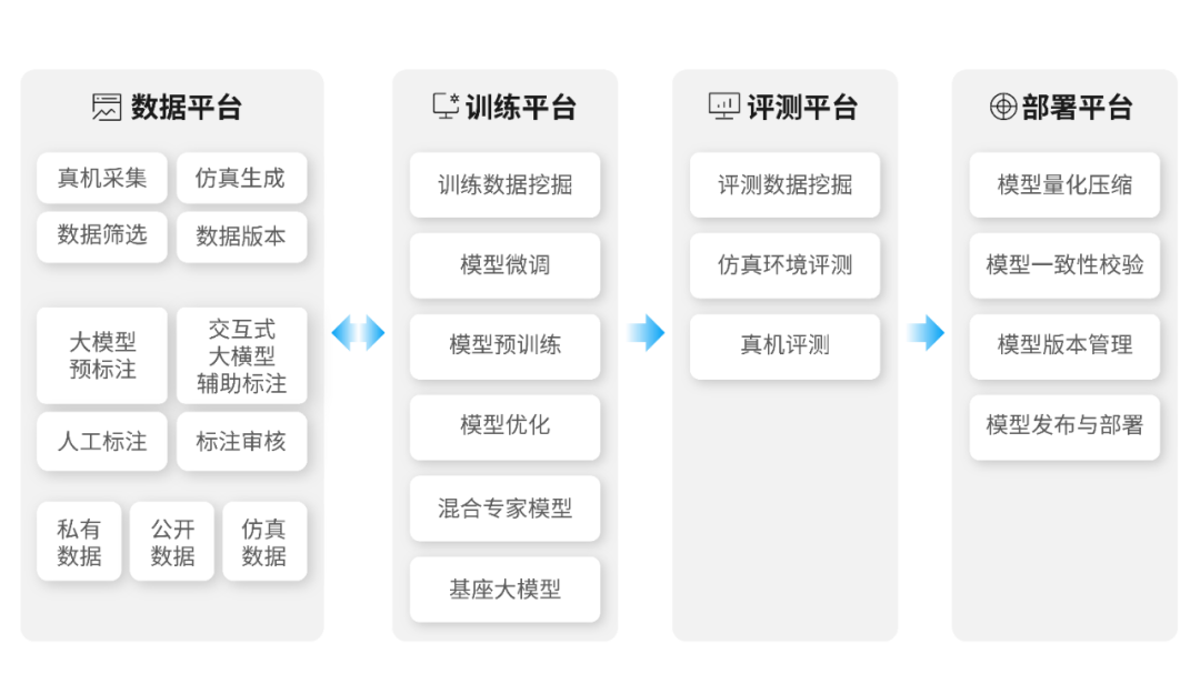 Geek+ Brain 使用基于千萬量級(jí)公開數(shù)據(jù)集訓(xùn)練的預(yù)訓(xùn)練模型,再經(jīng)過仿真數(shù)據(jù)與數(shù)年積累的行業(yè)數(shù)據(jù)進(jìn)行模型后訓(xùn)練,最終得到可實(shí)時(shí)處理 2D/3D 圖像陣列的高性能視覺抓取模型。同時(shí), Geek+ Brain 構(gòu)建數(shù)據(jù)生產(chǎn)、模型訓(xùn)練、評(píng)測(cè)、部署四大核心平臺(tái),提供完整的數(shù)據(jù)閉環(huán)支撐。