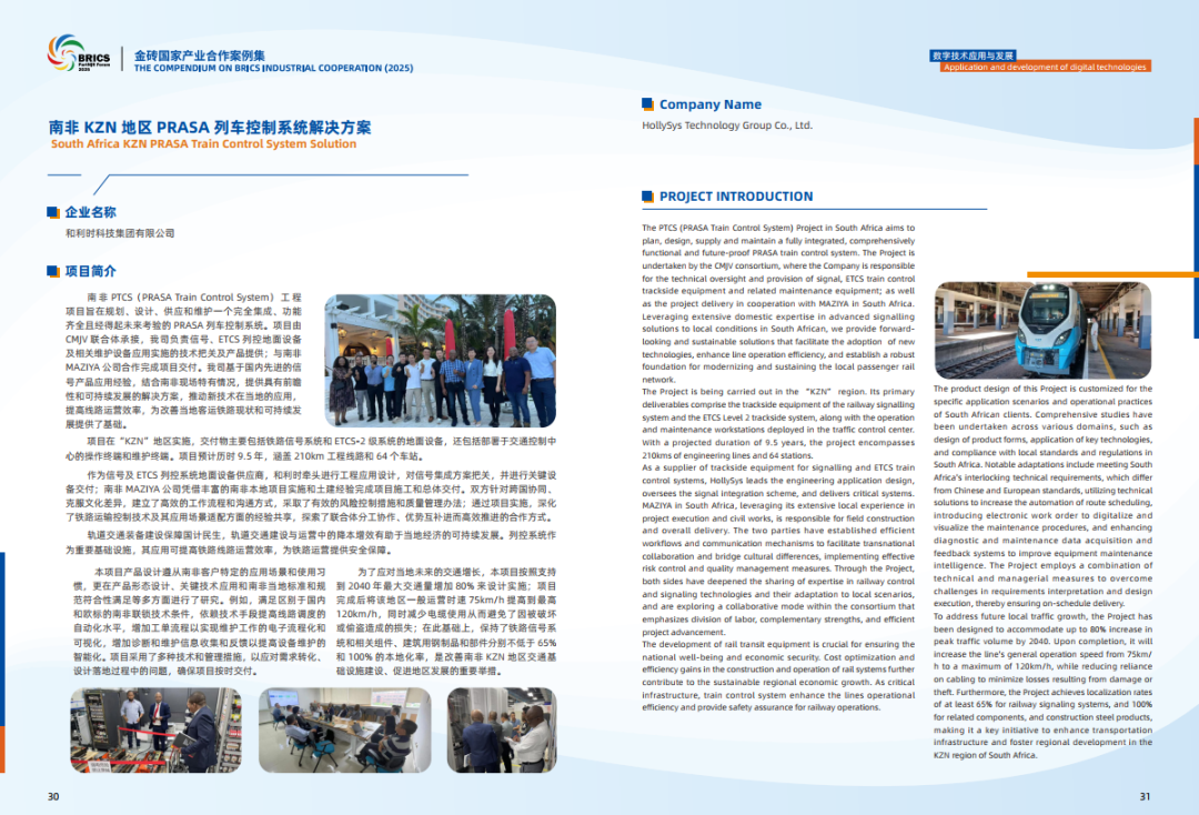 此外,和利時(shí)集團(tuán)申報(bào)的《南非KZN地區(qū)PRASA列車(chē)控制系統(tǒng)解決方案》成功入選《2025金磚國(guó)家產(chǎn)業(yè)合作案例》。該方案通過(guò)自主可控的列控技術(shù),有效提升南非KZN地區(qū)鐵路通勤效率與安全水平,為當(dāng)?shù)毓I(yè)化基礎(chǔ)設(shè)施升級(jí)提供了可靠支撐。