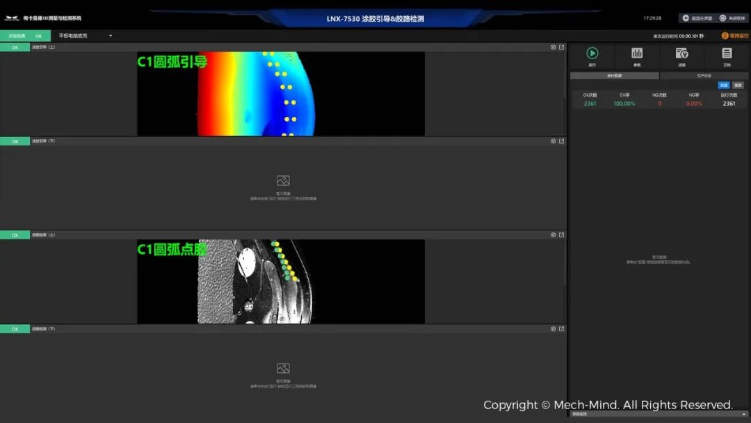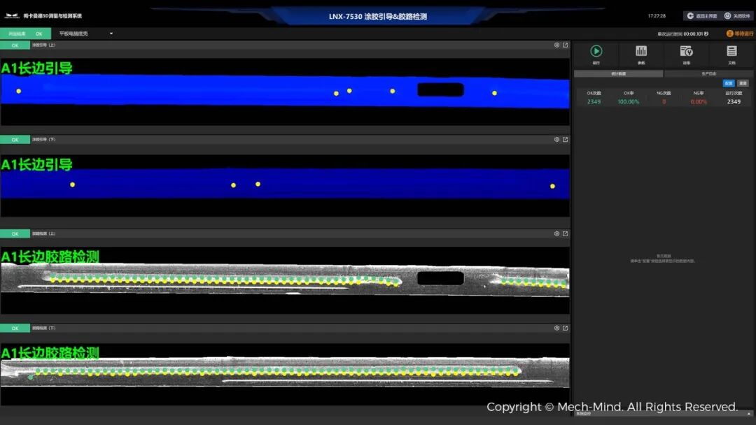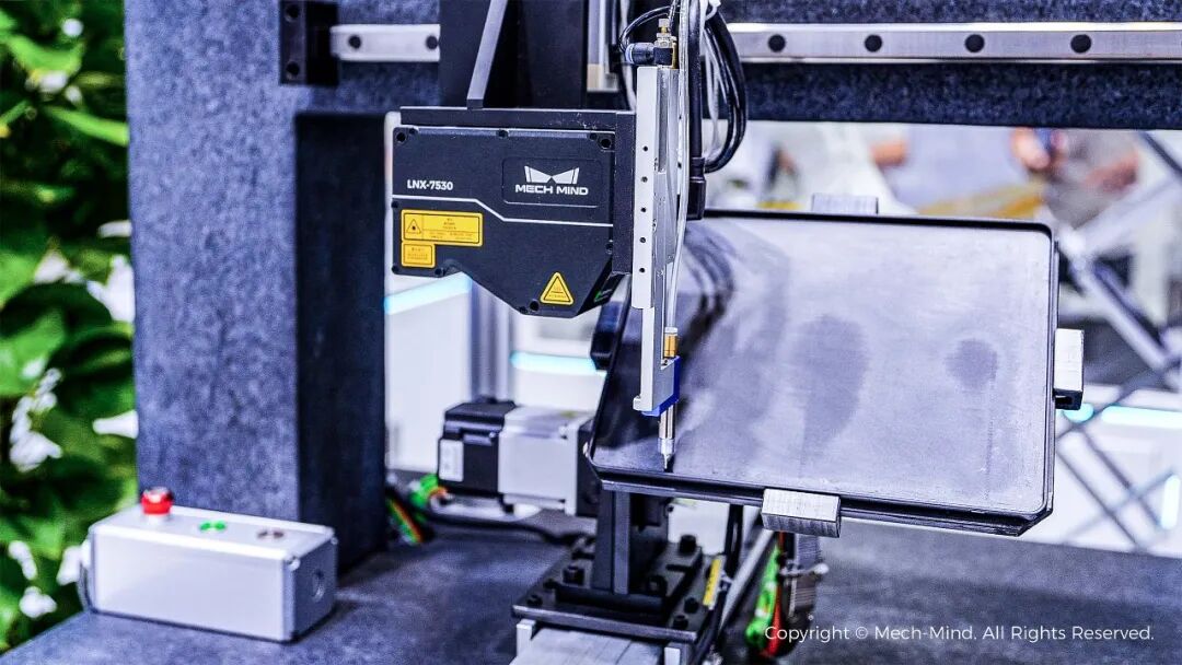 Mech-Eye LNX-7530搭配Mech-MSR測量軟件,能夠智能識別平板電腦底殼邊框輪廓,并自動規(guī)劃涂膠軌跡,真實場景中可引導(dǎo)膠槍等涂膠設(shè)備按軌跡快速完成涂膠、點膠任務(wù)。涂膠完成之后,還可自主識別透明、半透明膠路,快速精準(zhǔn)檢測膠路寬度、高度、位置度等特征,確保涂膠質(zhì)量滿足實際生產(chǎn)要求。