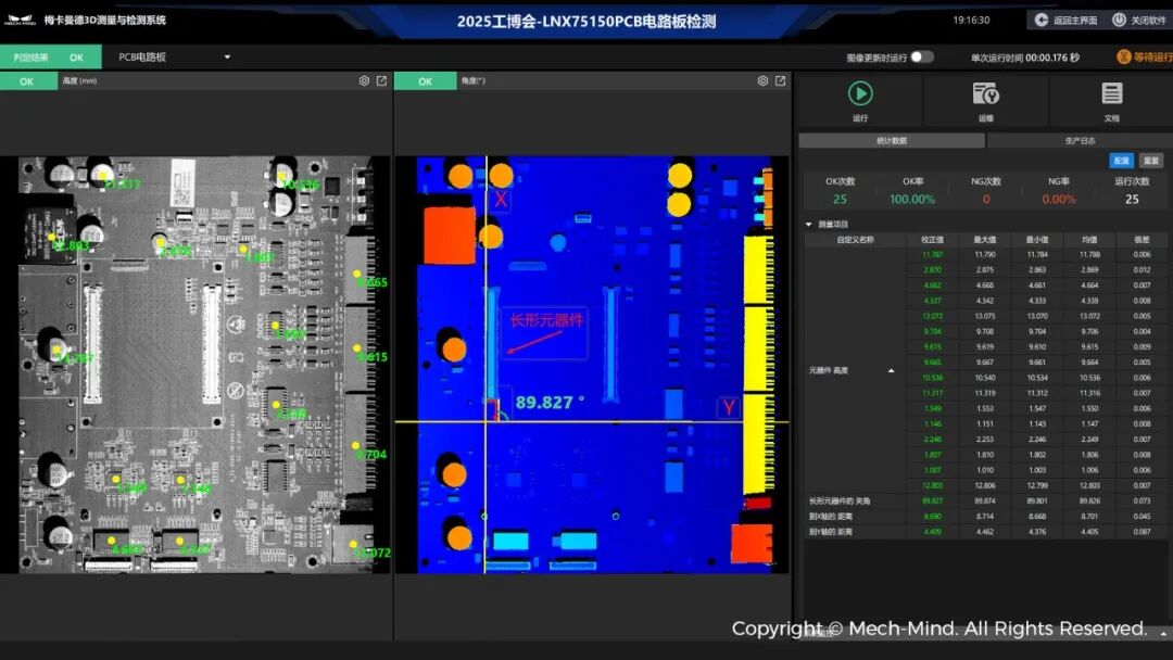 Mech-Eye LNX-75150每條輪廓點數(shù)3200,掃描速率10kHz,且支持單幀HDR,能夠?qū)CB板上不同材質(zhì)的微小元器件進(jìn)行高精度、高速掃描。搭配Mech-MSR測量軟件,可自主快速測量高度、位置度等多項參數(shù),滿足實際應(yīng)用中多樣化測量需求。該應(yīng)用已在PCB、半導(dǎo)體、3C等多個領(lǐng)域廣泛落地。
