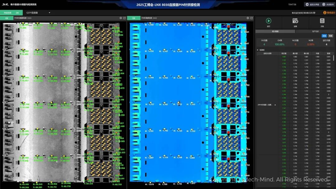 Mech-Eye LNX-8030具備4K超高分辨率、15kHz超高掃描速率,可對結(jié)構(gòu)微小、密集排列的Pin針生成高分辨率3D點云。結(jié)合智能去噪等AI算法,有效解決Pin針材質(zhì)反光、多重反射、易被遮擋等問題,智能識別并提取Pin針端面,實現(xiàn)精準(zhǔn)穩(wěn)定測量。系統(tǒng)適應(yīng)性強,真實場景中可泛化檢測不同種類、型號、材質(zhì)的Pin針。