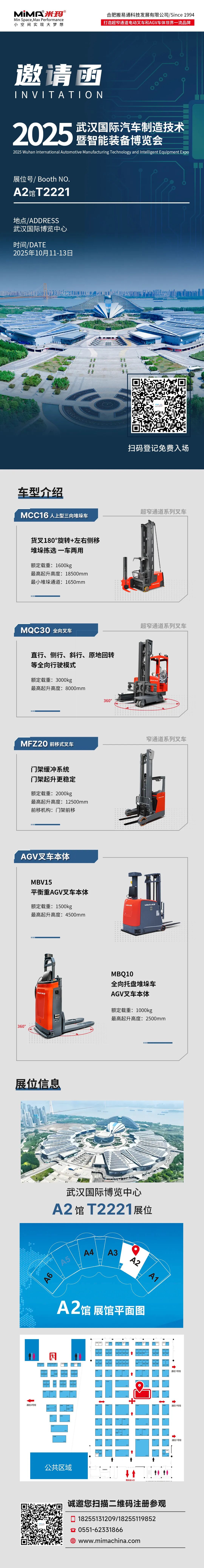 誠(chéng)邀您于10月11日蒞臨武漢國(guó)際博覽中心合肥搬易通(MiMA):A2館 T2221展位,親身體驗(yàn)智能物流的創(chuàng)新成果,共同探討汽車制造領(lǐng)域物料搬運(yùn)的智能化解決方案。