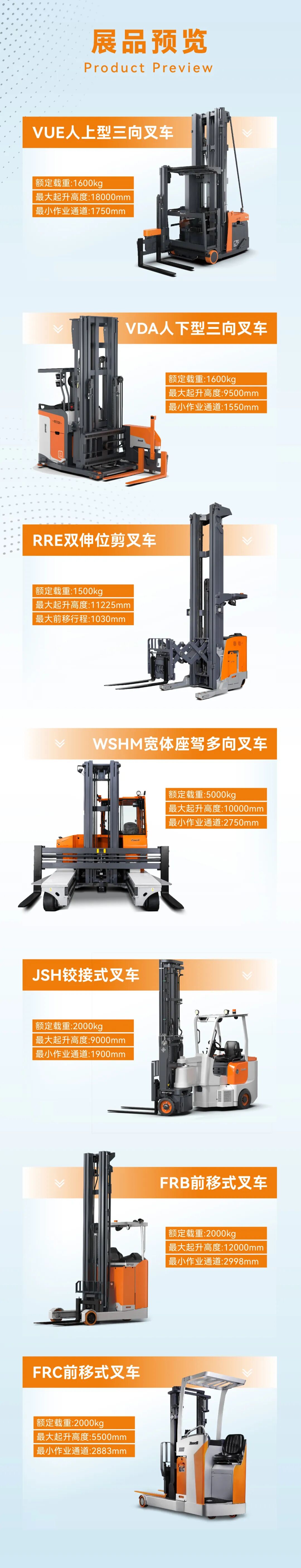 本次參展,卓一將帶來七款熱門車型,包括:人上型三向叉車、人下型三向叉車、雙伸位剪叉車、寬體座駕多向叉車、鉸接式叉車、FRB前移式叉車、FRC前移式叉車。