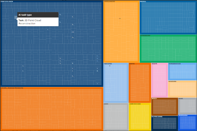 為了理解這種多樣性,我們從Papers with Code 的最新 (SOTA)排行榜中抓取了一個(gè)開放的 AI 模型數(shù)據(jù)集。該數(shù)據(jù)集涵蓋了數(shù)百個(gè)基準(zhǔn)測(cè)試中的 20,000 多個(gè)任務(wù)。這些資源來(lái)自各種技術(shù)論文(例如 arXiv 預(yù)印本、AI 會(huì)議論文集等)、排行榜(例如SuperGLUE、HELM、Visual Questions answer reasoning)以及相關(guān)的 GitHub 代碼庫(kù)。該數(shù)據(jù)集提供了數(shù)千個(gè)機(jī)器學(xué)習(xí)和 AI 任務(wù)及模型的基準(zhǔn)性能。