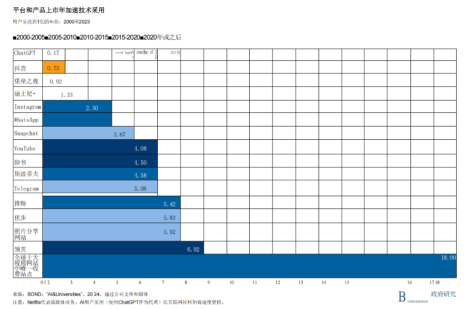 對(duì)大型模型的關(guān)注反映了生成式人工智能進(jìn)入公眾意識(shí)和職場(chǎng)應(yīng)用的速度。如圖4所示,ChatGPT在短短幾個(gè)月內(nèi)就擁有了1億用戶,其普及速度甚至超過了Instagram、Facebook甚至iPhone等平臺(tái)。這種可及性和普及度的急劇上升曲線在技術(shù)傳播史上是前所未有的。它標(biāo)志著人們對(duì)數(shù)字化的基準(zhǔn)預(yù)期和技術(shù)普及時(shí)間從數(shù)年縮短至數(shù)天。