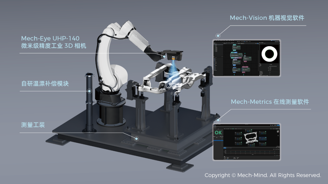 梅卡曼德在線測量系統(tǒng)集成了自主研發(fā)的Mech-Eye UHP-140微米級精度3D相機(jī)、Mech-Vision機(jī)器視覺軟件、Mech-Metrics在線測量軟件等高性能軟硬件產(chǎn)品。