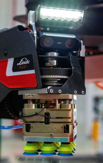 在任務(wù)調(diào)度與環(huán)境感知方面,RoCaP與羅斯曼現(xiàn)有的倉儲管理系統(tǒng)(WMS)通過服務(wù)器接口相連。每一項(xiàng)揀選任務(wù)都會由上位系統(tǒng)下發(fā),RoCaP管理系統(tǒng)會綜合訂單貨物的尺寸、重量以及路徑優(yōu)化等參數(shù),自動計(jì)算下一處貨位位置。車輛抵達(dá)后,機(jī)械臂開始工作:搭載NVIDIA(英偉達(dá))AI芯片的3D相機(jī)首先對托盤進(jìn)行識別和校驗(yàn),對作業(yè)區(qū)域進(jìn)行三維測量與空間劃定,然后執(zhí)行復(fù)雜的表面掃描算法,確定每個(gè)包裝箱在托盤上的精確位置及最優(yōu)抓取順序,最終利用真空技術(shù)完成吸取與搬運(yùn)。
