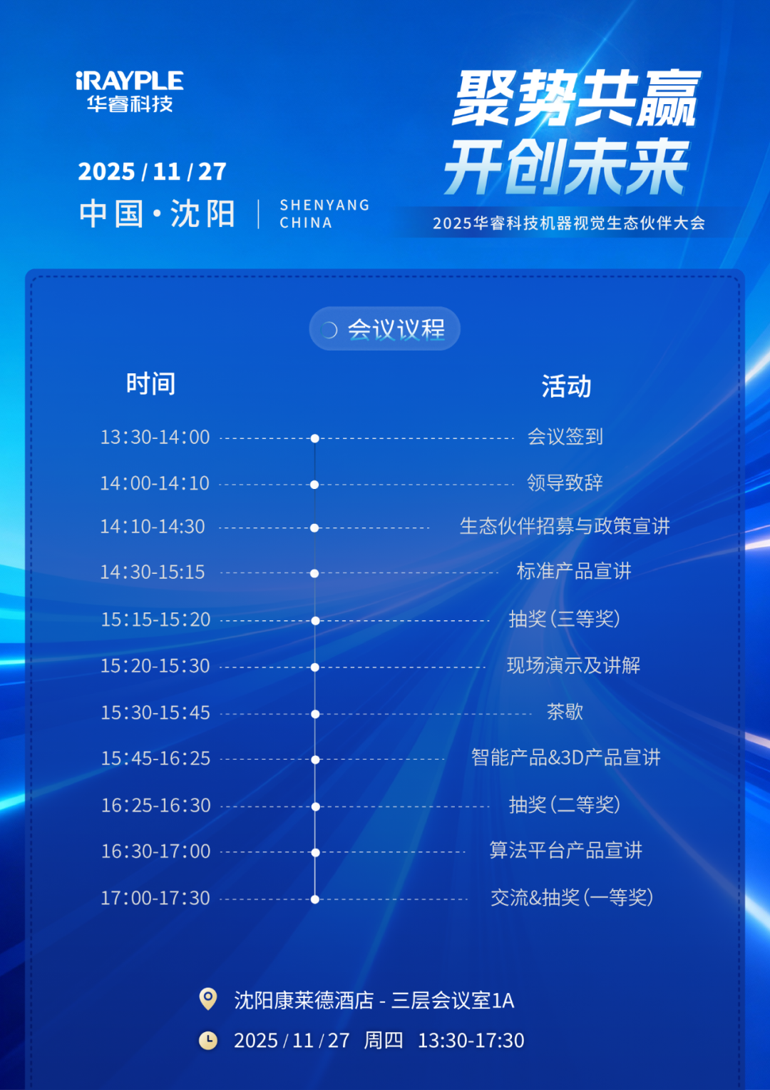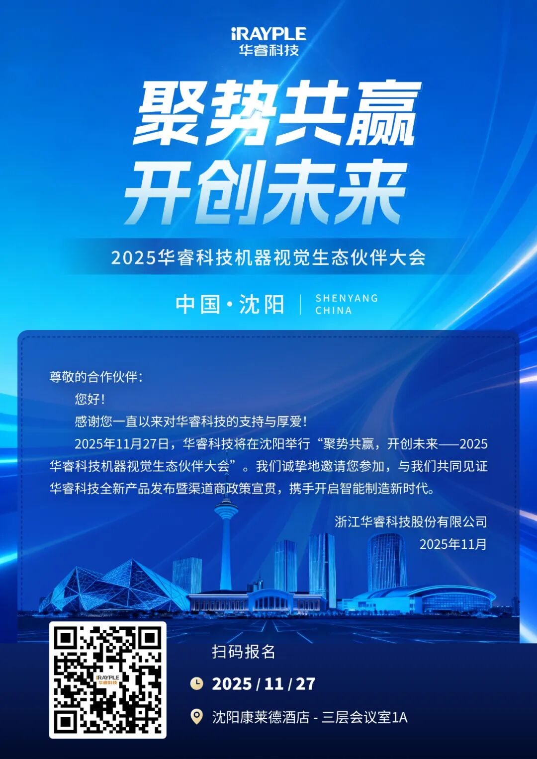 聚勢(shì)共贏,開創(chuàng)未來!2025年11月27日,華睿科技將于沈陽康萊德酒店舉辦“2025機(jī)器視覺生態(tài)伙伴大會(huì)”。誠邀行業(yè)同仁與合作伙伴齊聚一堂,共話智能制造新篇章!本次大會(huì)看點(diǎn)搶先看:- 生態(tài)伙伴招募 與 政策宣講- 標(biāo)準(zhǔn)產(chǎn)品重磅亮相- 智能產(chǎn)品&3D產(chǎn)品發(fā)布- 算法平臺(tái)深度解析- 案例分享 & 新品動(dòng)態(tài)demo- 驚喜抽獎(jiǎng)不斷(飛利浦筋膜槍,小米充電寶,華睿定制雙肩包,華睿定制天堂傘)時(shí)間:2025年11月27日 13:30–17:30地點(diǎn):沈陽康萊德酒店掃碼立即報(bào)名,現(xiàn)場(chǎng)更有精美禮品等您拿!