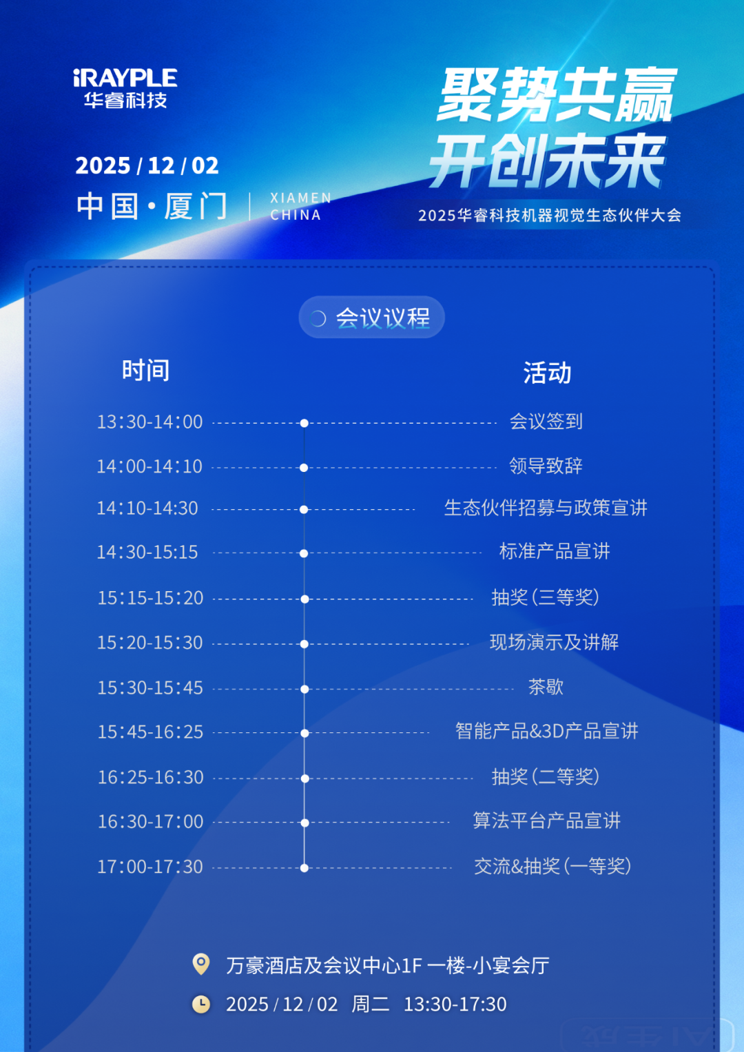 聚勢共贏,開創(chuàng)未來!2025年12月2日,華睿科技將于廈門萬豪酒店舉辦“2025機(jī)器視覺生態(tài)伙伴大會(huì)”。誠邀行業(yè)同仁與合作伙伴齊聚一堂,共話智能制造新篇章!本次大會(huì)看點(diǎn)搶先看:- 生態(tài)伙伴招募 與 政策宣講- 標(biāo)準(zhǔn)產(chǎn)品重磅亮相- 智能產(chǎn)品&3D產(chǎn)品發(fā)布- 算法平臺(tái)深度解析- 案例分享 & 新品動(dòng)態(tài)demo- 驚喜抽獎(jiǎng)不斷(飛利浦筋膜槍,小米充電寶,華睿定制雙肩包,華睿定制天堂傘)時(shí)間:2025年12月2日 13:30–17:30地點(diǎn):廈門萬豪酒店掃碼立即報(bào)名,現(xiàn)場更有精美禮品等您拿!