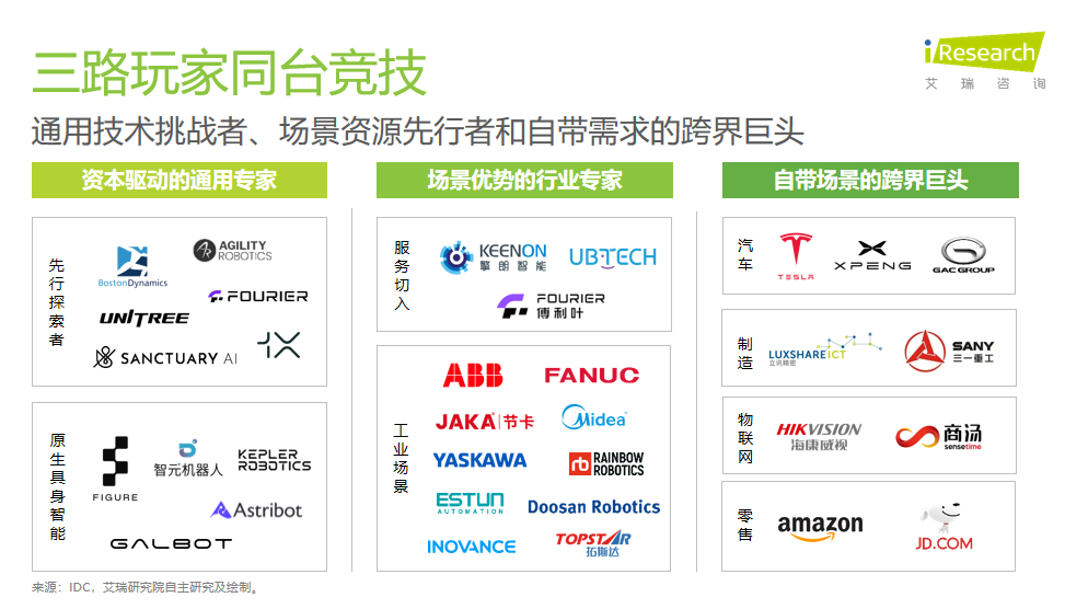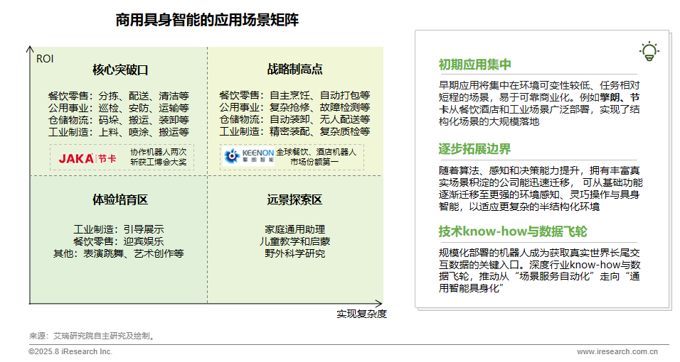 近日,國(guó)內(nèi)最大的TMT研究機(jī)構(gòu)艾瑞咨詢(xún)正式發(fā)布《2025商用具身智能白皮書(shū)》(以下簡(jiǎn)稱(chēng)“報(bào)告”),全景分析全球具身智能在商用場(chǎng)景上所面臨的技術(shù)演進(jìn)與商業(yè)落地趨勢(shì),并指出三路玩家同臺(tái)競(jìng)技,其中擎朗智能憑借“服務(wù)場(chǎng)景的綜合技術(shù)力第一”、“行業(yè)出口第一”、“全球餐飲、酒店機(jī)器人市場(chǎng)份額第一”等多項(xiàng)突出成果與優(yōu)異的商用落地地位,與Figure、特斯拉與宇樹(shù)科技等企業(yè)作為全球行業(yè)頂尖企業(yè)代表案例被收錄其中,共同定義具身智能未來(lái)。