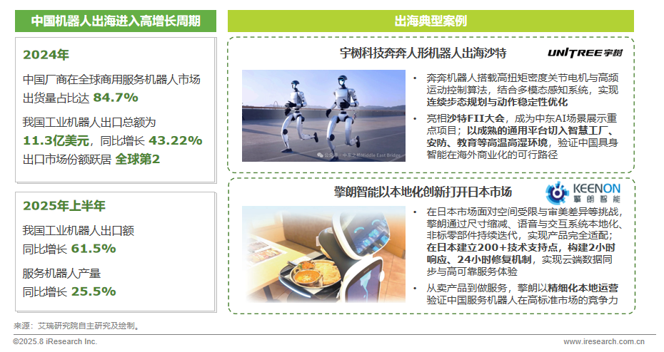 2024-2025年,中國(guó)具身智能產(chǎn)業(yè)進(jìn)入出海加速期,機(jī)器人出口同比增長(zhǎng)顯著,形成全球第二大出口市場(chǎng)。以宇樹(shù)科技與擎朗智能的出海案例分別體現(xiàn)了技術(shù)自主創(chuàng)新與本地化適配兩條典型路徑,驗(yàn)證了中國(guó)具身智能在全球高標(biāo)準(zhǔn)市場(chǎng)的商業(yè)化可行性。