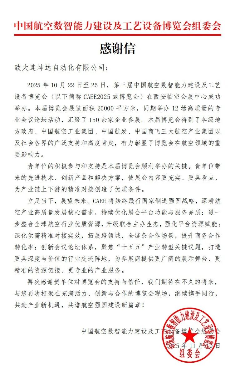 在第三屆中國(guó)航空數(shù)智能力建設(shè)及工藝設(shè)備博覽會(huì)(CAEE2025)落幕后,組委會(huì)在致大連坤達(dá)自動(dòng)化有限公司的感謝信中,特意強(qiáng)調(diào)了大連坤達(dá)的技術(shù)貢獻(xiàn)。