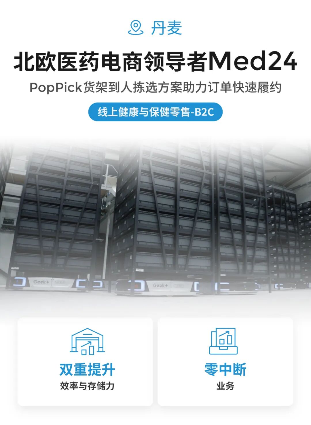 在丹麥,北歐醫(yī)藥電商領(lǐng)導(dǎo)者Med24在倉庫中成功部署PopPick貨架到人方案,在業(yè)務(wù)零中斷的同時,實現(xiàn)效率與存儲力的顯著提升,助力Med24成為北歐醫(yī)藥健康行業(yè)的領(lǐng)先典范。