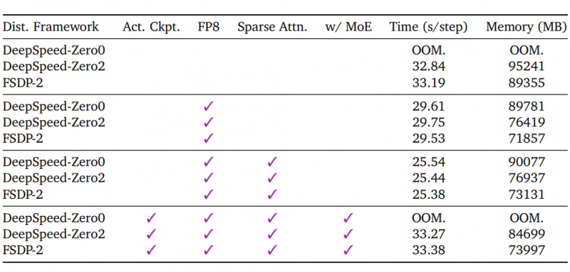 實(shí)驗(yàn)數(shù)據(jù)顯示,F(xiàn)SDP-2 分布式框架結(jié)合 FP8 精度,在 8 卡 H20 GPU、批量大小 32 的配置下,可實(shí)現(xiàn)高效訓(xùn)練,且稀疏注意力機(jī)制的引入進(jìn)一步提升了訓(xùn)練與推理效率,讓大模型訓(xùn)練不再依賴超大規(guī)模算力集群。