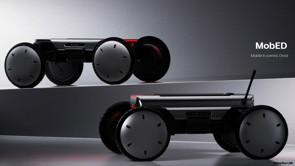 在硬件層面,MobED的最大特點(diǎn)是基于偏心機(jī)構(gòu)的姿態(tài)控制與一體化Drive-and-Lift(DnL)模塊。DnL模塊將驅(qū)動(dòng)電機(jī)、轉(zhuǎn)向電機(jī)與升降機(jī)構(gòu)高度集成,使平臺(tái)可以在行駛過程中實(shí)時(shí)調(diào)節(jié)高度和姿態(tài),應(yīng)對(duì)坡道、不平路面甚至路沿等復(fù)雜地形。官方介紹中提到,其優(yōu)化控制算法借鑒多關(guān)節(jié)機(jī)器人運(yùn)動(dòng)學(xué),可在不平整地面保持平臺(tái)水平,并實(shí)現(xiàn)多方向平滑運(yùn)動(dòng),這使MobED能夠進(jìn)入傳統(tǒng)小型移動(dòng)機(jī)器人難以勝任的工況。