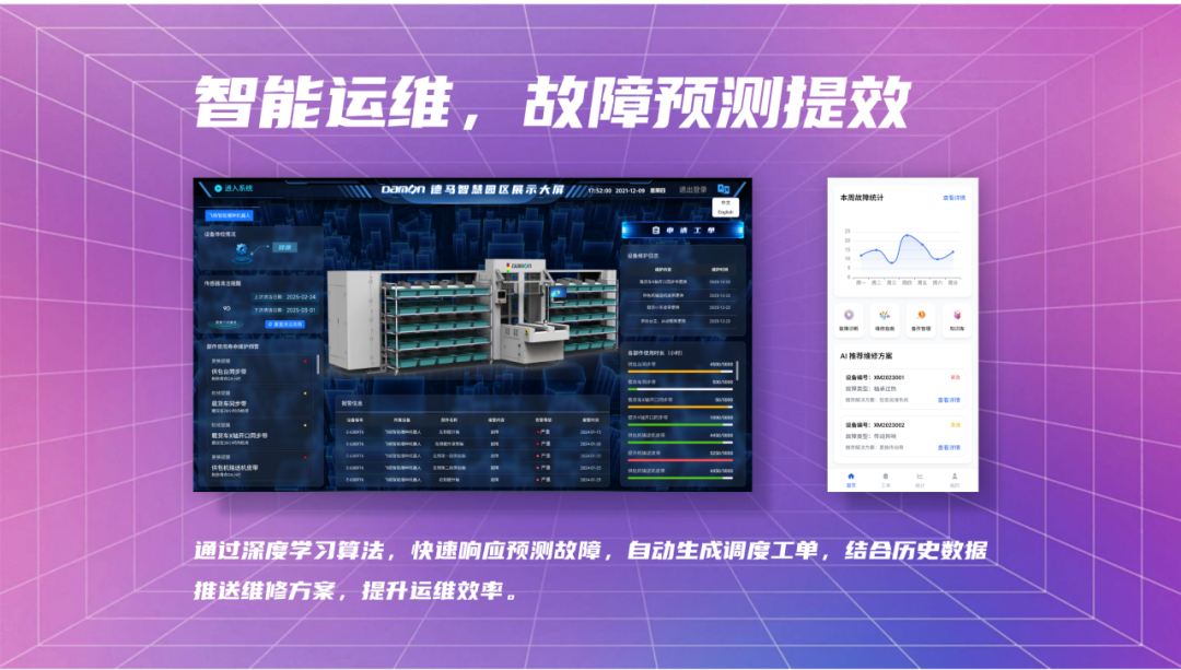 德馬以虛擬仿真與數(shù)據(jù)驅(qū)動為核心,自主研發(fā)虛擬仿真聯(lián)調(diào)平臺,可全面模擬驗證物流系統(tǒng)的運行流程,提前排查問題,使現(xiàn)場調(diào)試周期縮短60%,降低項目交付風險。同時,德馬天璣(PHM)系統(tǒng)通過融合DeepSeek大模型,構(gòu)建起“自感知、自決策、自執(zhí)行”的智慧運維新生態(tài),為全球客戶提供持續(xù)優(yōu)化的物流運營策略,實現(xiàn)設備全生命周期管理從“被動維修”到“預測性維護”的服務模式躍遷。