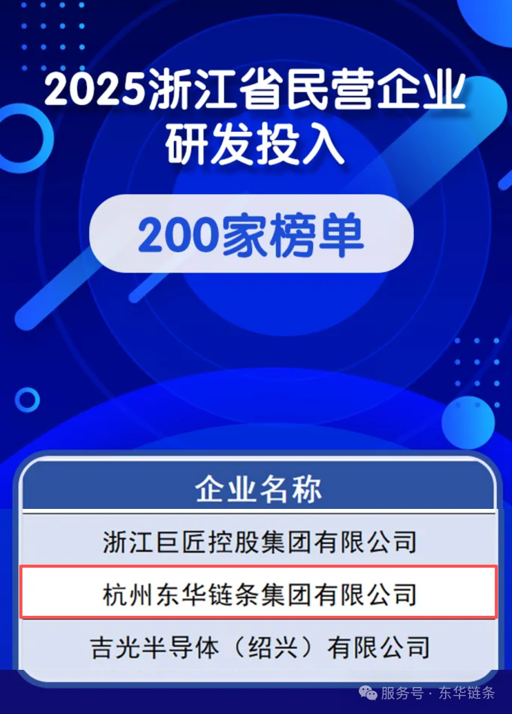 在此次評選中,東華鏈條集團憑借在中國及世界鏈傳動行業(yè)制造領域的深厚積淀、持續(xù)的研發(fā)投入以及突出的創(chuàng)新成果,成功入選浙江省制造業(yè)民營企業(yè)200強、浙江省民營企業(yè)研發(fā)投入200家、浙江省民營企業(yè)發(fā)明專利200家三項重要榜單,彰顯了集團在高質量發(fā)展道路上的硬核實力與領先地位。