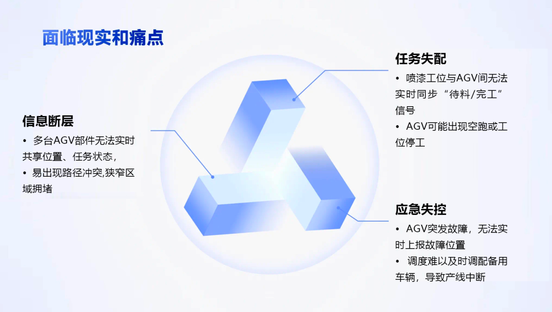 在裝配噴漆產(chǎn)線項目中,航空部件屬于涉密物資,車間需嚴格遵守保密規(guī)定——所有設(shè)備禁止接入外部網(wǎng)絡(luò),且內(nèi)部通訊需采用加密離線模式。這一限制導(dǎo)致傳統(tǒng)依賴實時在線傳輸?shù)腁GV調(diào)度系統(tǒng)完全失效,具體面臨三大難題:
