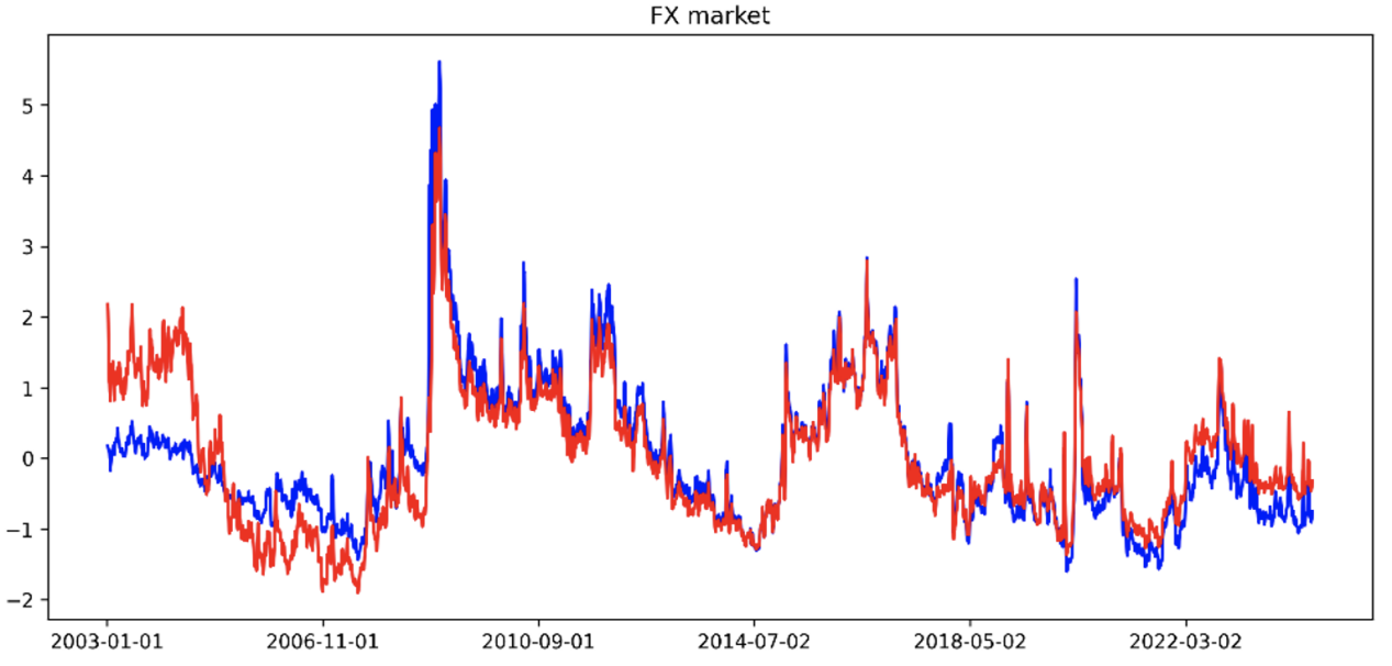 注:真實(shí)數(shù)據(jù):以美元為交易貨幣的歐元兌日元每日三角套利平價(jià)差的20天平均值,按分鐘計(jì)算。垂直紅色虛線代表訓(xùn)練期結(jié)束時(shí)間,即2020年底;該線右側(cè)的所有數(shù)據(jù)均視為偽樣本外數(shù)據(jù)。
