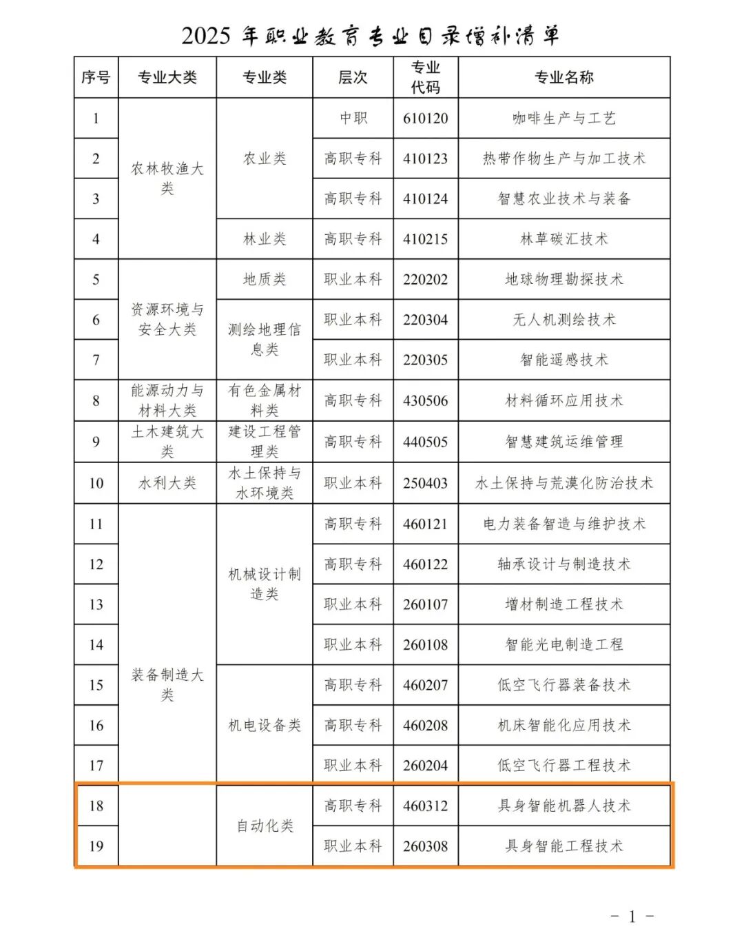 近日,教育部辦公廳正式印發(fā)《關(guān)于做好2026年職業(yè)教育擬招生專業(yè)設(shè)置管理工作的通知》(教職成廳函〔2025〕27號),同步公布《2025年職業(yè)教育專業(yè)目錄增補清單》。清單明確在“裝備制造大類—自動化類”下增設(shè)高職??茖I(yè)“具身智能機器人技術(shù)”(專業(yè)代碼460312)及職業(yè)本科專業(yè)“具身智能工程技術(shù)”(專業(yè)代碼260308)。