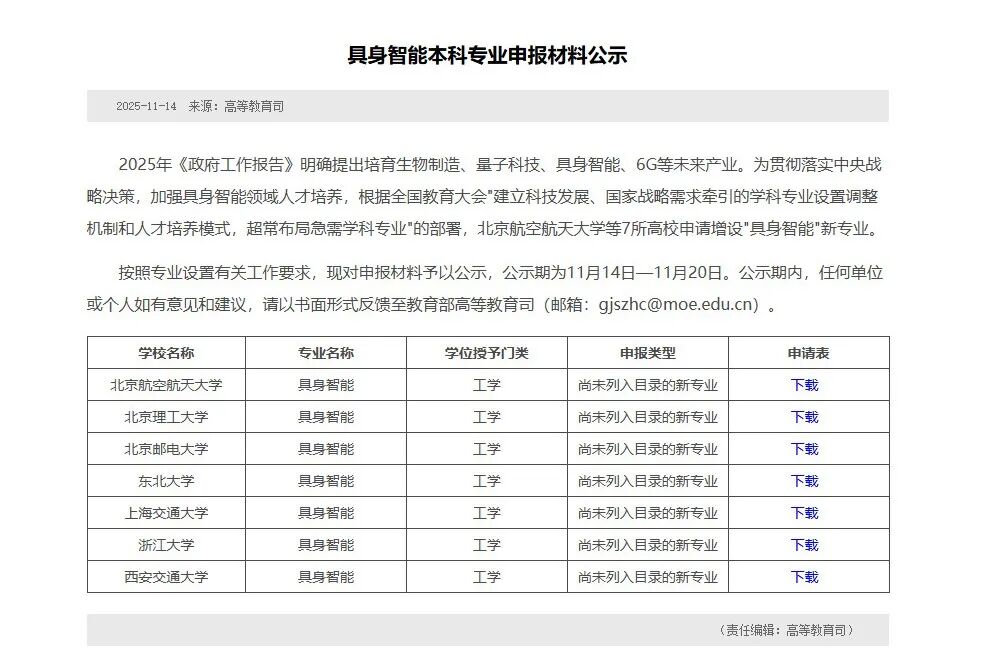 為此,高等教育層面的具身智能專業(yè)布局也在同步推進。近日教育部發(fā)布的《具身智能本科專業(yè)申報材料公示》顯示,北京航空航天大學、浙江大學、西安交通大學等7所高校已集中申報“具身智能”本科專業(yè),將依托各校優(yōu)勢學科開展特色化高端人才培養(yǎng),從不同技術(shù)路徑切入具身智能領(lǐng)域。