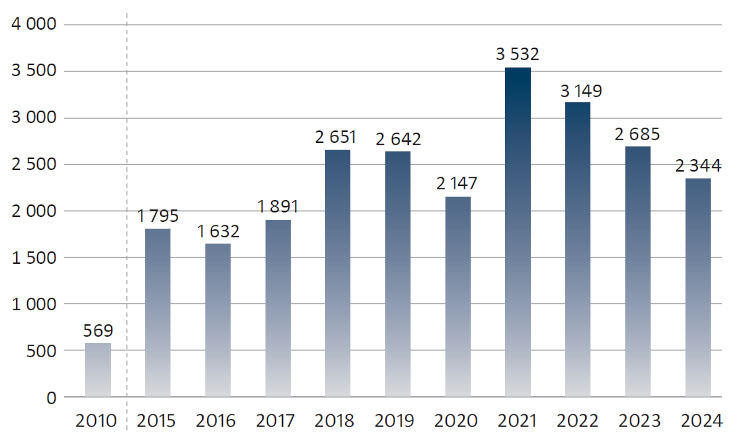 根據(jù)國際機器人聯(lián)合會(IFR)發(fā)布的《2025年世界機器人報告》,2024年波蘭共安裝了2344臺新機器人,比上一年下降了13%。這也是波蘭工業(yè)機器人安裝量連續(xù)第三年下降,此前在2021年曾創(chuàng)下歷史新高,當年波蘭安裝了3532臺工業(yè)機器人。