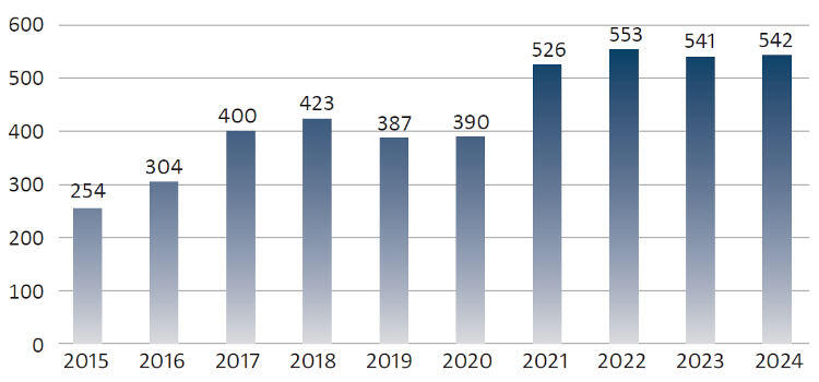 全球市場保持穩(wěn)定,2024年新增機器人數(shù)量為54.2萬臺,略高于上年。中國依然穩(wěn)居市場領(lǐng)先地位,去年新增機器人數(shù)量達29.5萬臺,占全球新增總量的54%以上。日本位居第二,2024年新增機器人數(shù)量為4.45萬臺。
