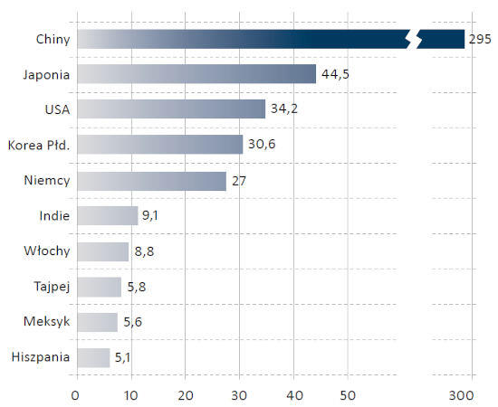 相比之下,全球平均水平目前為每1萬名工人擁有177臺機器人,這意味著波蘭的表現(xiàn)比全球平均水平差了兩倍多。在亞洲,這一數(shù)字達到204臺,歐洲為148臺,美洲為131臺。當我們觀察全球機器人化領(lǐng)先國家時,差距更加顯著。在韓國,每1萬名工人就擁有超過1000臺機器人——是波蘭的12倍之多。新加坡的機器人數(shù)量即將達到800臺,而中國、德國和日本到2023年都將超過400臺。