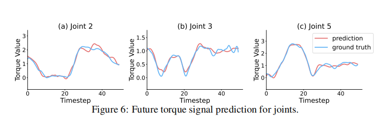 實(shí)驗(yàn)顯示,模型能準(zhǔn)確預(yù)測(cè)未來(lái)50步的扭矩變化(見(jiàn)下圖),顯著提升接觸任務(wù)成功率。