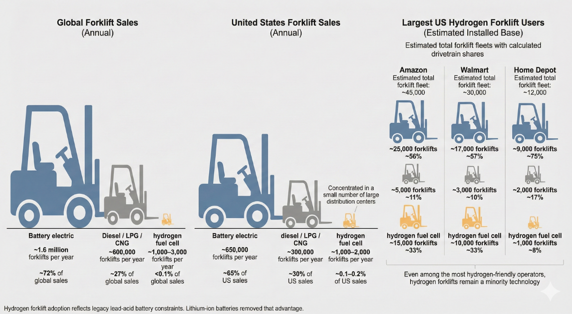 Home Depot也呈現(xiàn)出同樣的模式,只是信息披露更少。自2010年代中期以來,它就在部分配送中心使用氫叉車。公開渠道沒有任何來源能夠全面統(tǒng)計(jì)其美國業(yè)務(wù)中氫叉車數(shù)量或叉車總量。基于設(shè)施數(shù)量與常見叉車密度進(jìn)行估算,同樣會(huì)得到這樣的車隊(duì)結(jié)構(gòu):氫叉車確實(shí)存在,但顯然處于電池電動(dòng)設(shè)備之后的次要位置。缺少公開總量并不意味著氫占據(jù)主導(dǎo),這只不過反映了企業(yè)常規(guī)的信息披露方式。