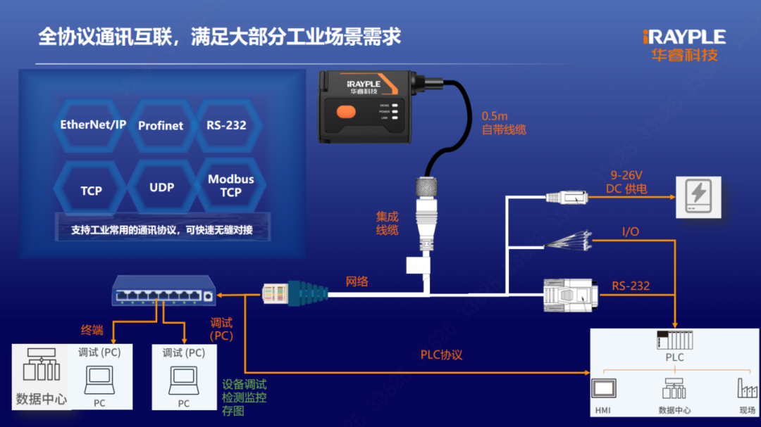 產(chǎn)品自帶百兆網(wǎng)絡(luò),內(nèi)置多路IO通訊,同時(shí)集成Profinet/EIP/Modbus等工業(yè)協(xié)議和TCP/ UDP/串口通用接口,可支持多種協(xié)議同時(shí)通信,滿足PLC、機(jī)器人等多設(shè)備協(xié)同需求。