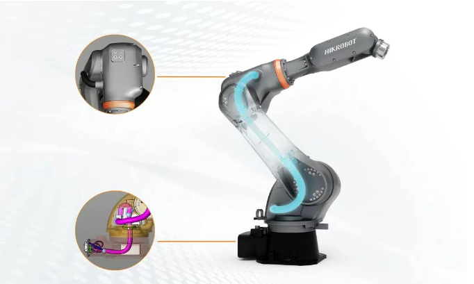 本體內置2路氣路與19路信號線,并額外集成網絡線纜,降低外部干涉風險,讓機器人在狹窄空間內也能靈活運轉,便于客戶集成部署,減少干涉,進一步提升產線空間利用率。