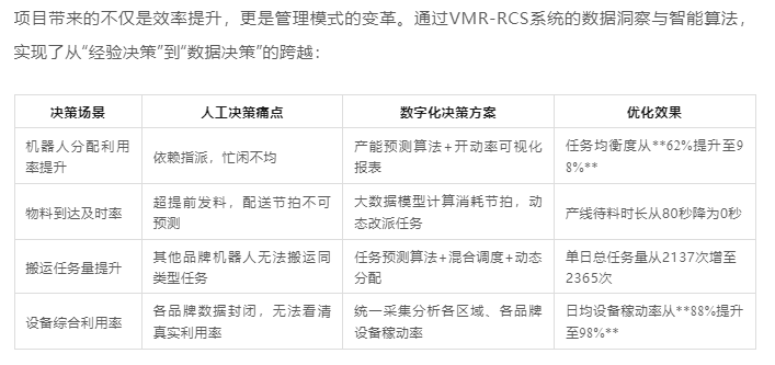 該項(xiàng)目已成功驗(yàn)收。L公司與威邁爾的合作,成功地將一個(gè)多品牌、多車型的復(fù)雜設(shè)備群整合為一個(gè)在“超級(jí)大腦”指揮下高效協(xié)同的有機(jī)整體。這一項(xiàng)目不僅顯著提升了物流效率、降低了運(yùn)維成本,更通過實(shí)現(xiàn)管理決策的數(shù)字化,為企業(yè)帶來了深遠(yuǎn)的戰(zhàn)略價(jià)值:打破了品牌鎖定的桎梏,構(gòu)建了面向未來的柔性物流架構(gòu)。