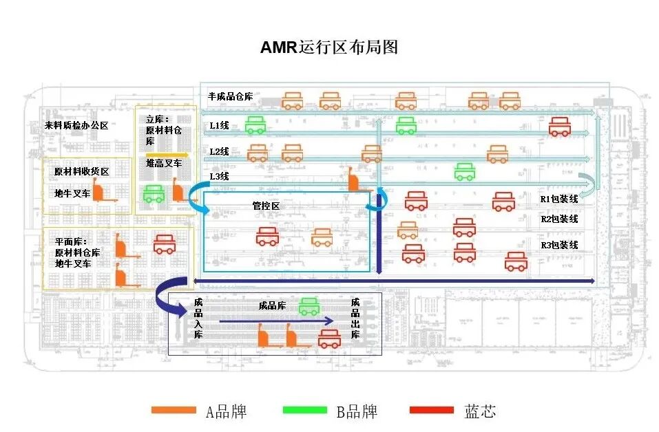 L公司生產(chǎn)物流體系已初步實(shí)現(xiàn)自動(dòng)化,部署了來自不同廠商的自動(dòng)化設(shè)備,包括A品牌的7臺(tái)潛伏AMR、7臺(tái)無人叉車和4臺(tái)輥筒AMR,以及B品牌的5臺(tái)潛伏AMR。這些設(shè)備在執(zhí)行原材料、在制品及成品的搬運(yùn)任務(wù)中發(fā)揮了重要作用。