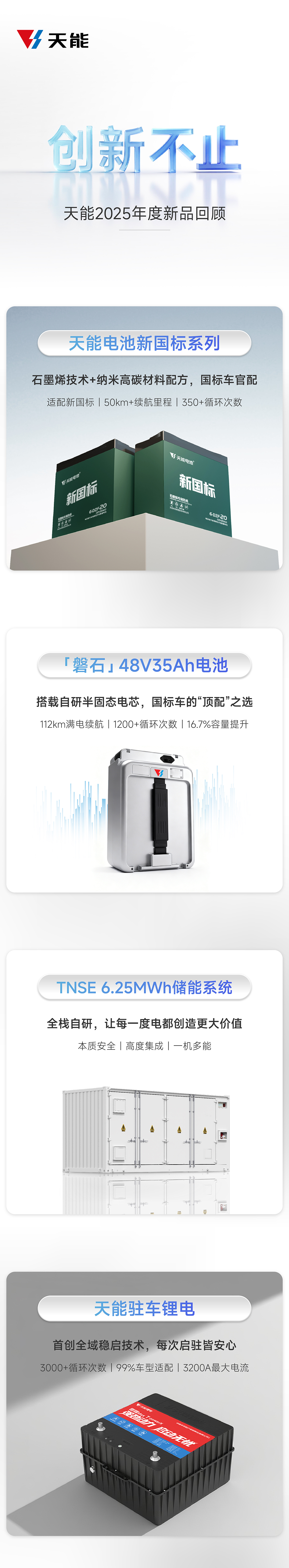 過去一年,天能的每一次產(chǎn)品創(chuàng)新,都始于一個具體的需求。我們思考如何讓電池在極寒中高效起動,在多場景下智能適配,在復雜應用中安全運行。從攻克低溫的“天鈉”系列,到引領行標的新國標電池,再到全面進化的商用車駐車鋰電。這些產(chǎn)品,是我們交付給具體場景的解決方案,更是我們回應用戶期待、始終如一的行動。