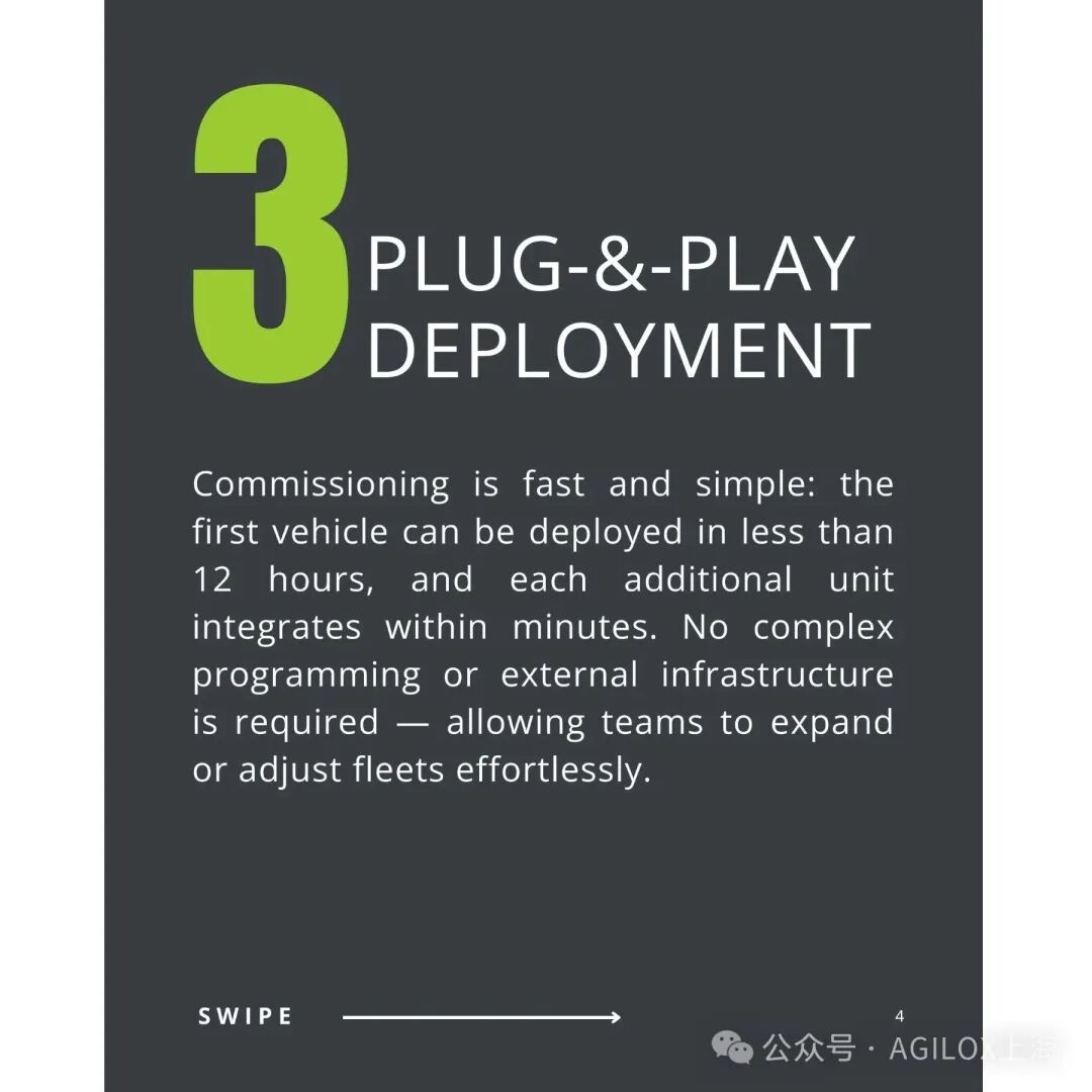 ? 即插即用式極速部署:時間就是效率,在物流領(lǐng)域更是如此。AGILOX X-SWARM技術(shù)實現(xiàn)了令人驚嘆的快速部署能力。第一臺 AGILOX 自主移動機器人從安裝到投入運行,僅需不到 12 小時,大大縮短了項目啟動周期。而且,每新增一臺設(shè)備,只需短短 15 分鐘即可完成集成和配置,迅速融入現(xiàn)有的物流系統(tǒng)。這種即插即用的特性,讓企業(yè)能夠快速響應(yīng)市場需求,靈活調(diào)整物流規(guī)模,搶占市場先機。