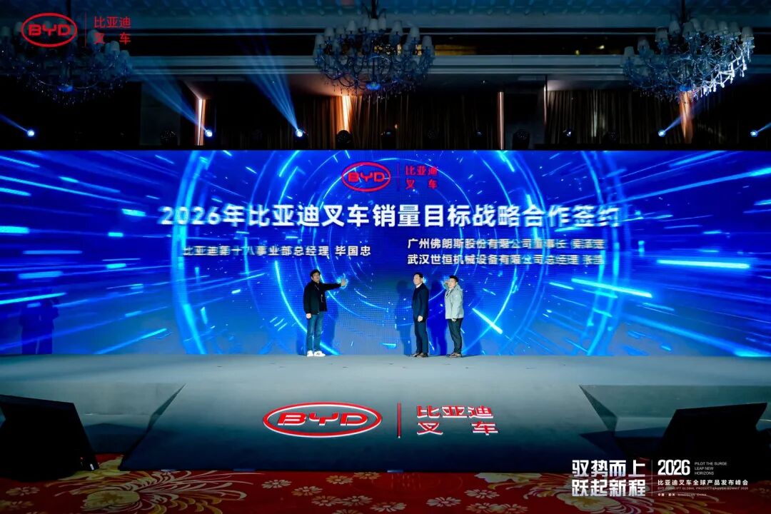 1月8日,以“馭勢(shì)而上,躍起新程”為主題的2026年比亞迪叉車全球產(chǎn)品發(fā)布峰會(huì)在廣東韶關(guān)召開。比亞迪集團(tuán)第十八事業(yè)部總經(jīng)理畢國(guó)忠先生攜事業(yè)部高層領(lǐng)導(dǎo),以及經(jīng)銷商代表、行業(yè)協(xié)會(huì)、媒體朋友們共話新未來,并一同見證了比亞迪叉車新品發(fā)布的榮光時(shí)刻。