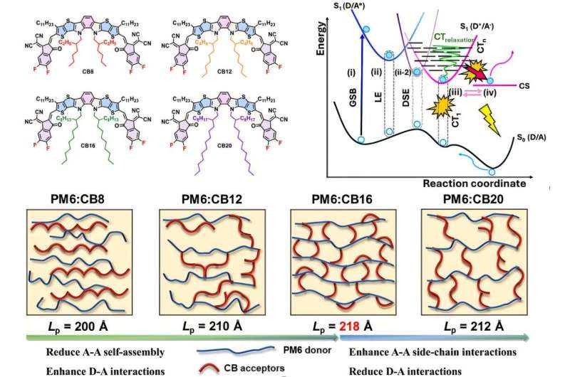 研究的核心策略是“側(cè)鏈長度的窗口化優(yōu)化”。團(tuán)隊(duì)圍繞一種C形的鄰位苯并二吡咯(ortho-benzodipyrrole)骨架受體,設(shè)計(jì)并合成了CB8、CB12、CB16、CB20等系列分子(名稱中的數(shù)字對應(yīng)側(cè)鏈長度差異),并與常用給體聚合物PM6進(jìn)行匹配驗(yàn)證。報(bào)道用“拼圖”作比喻:側(cè)鏈過短會導(dǎo)致分子堆積過緊、過度聚集,電荷容易被困在局部;側(cè)鏈過長又會把分子“撐”得太開,削弱連續(xù)傳輸路徑。實(shí)驗(yàn)結(jié)果顯示,CB16處在“恰到好處”的窗口區(qū)間,既抑制了不利的團(tuán)聚,又保留了足夠的分子耦合與貫通網(wǎng)絡(luò),從而形成更理想的給受體互穿結(jié)構(gòu)并提升載流子輸運(yùn)效率。