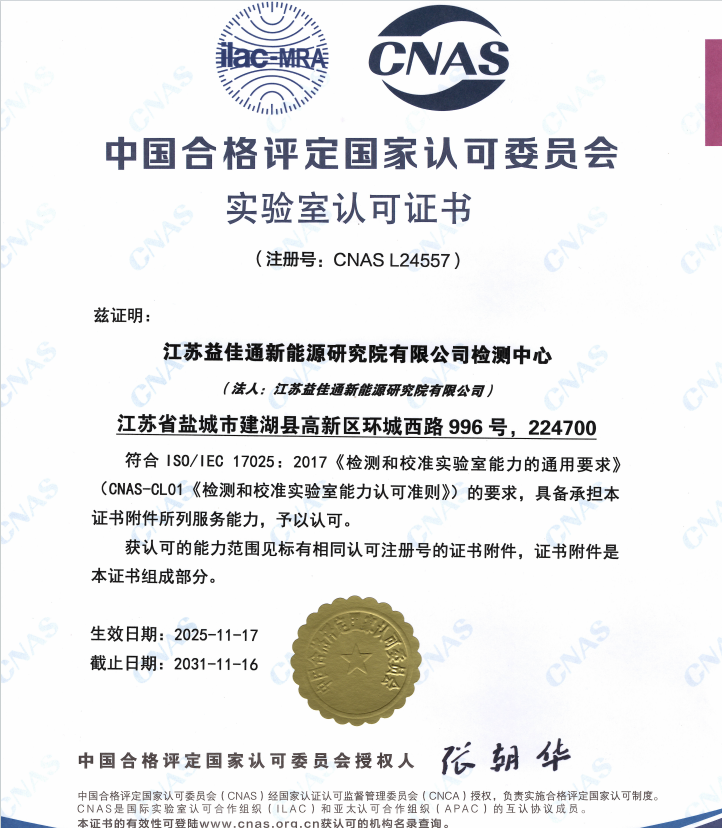 江蘇益佳通新能源研究院有限公司檢測(cè)中心(以下簡(jiǎn)稱研究院檢測(cè)中心),經(jīng)過嚴(yán)苛的專家團(tuán)評(píng)審過程,于2025年11月17日,成功獲得CNAS認(rèn)可。這標(biāo)志著益佳通對(duì)動(dòng)力電池的研究和測(cè)試更加具備規(guī)范性和權(quán)威性。