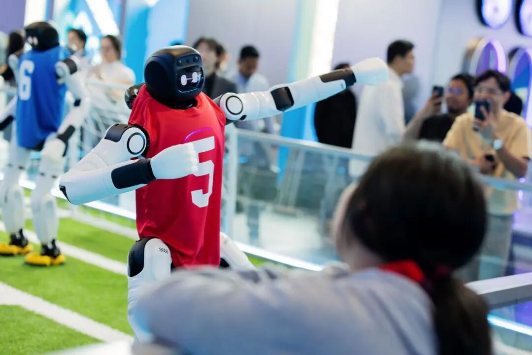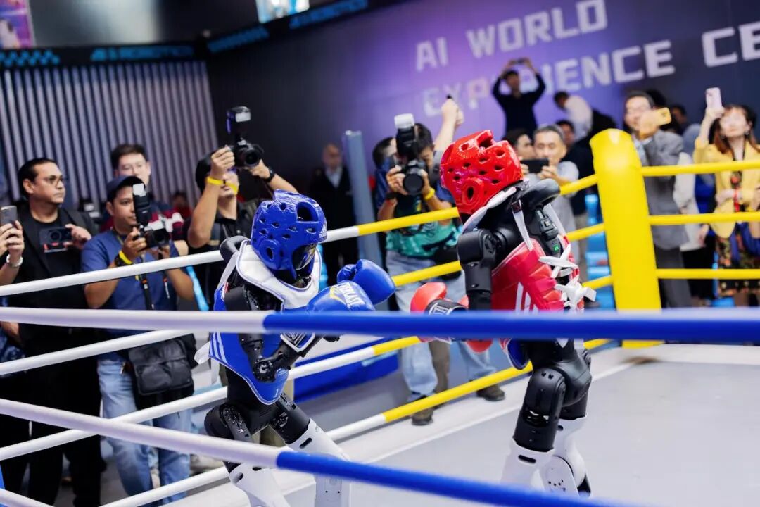 館內(nèi),智元全系列機器人化身百變角色,打造賽博世界。入口處,酷拓D1的舞獅表演與靈犀X2奏響的24節(jié)令鼓相映成趣,傳統(tǒng)文化與尖端科技融合,別有意趣。場館內(nèi),遠征A2變身場館“服務(wù)官”,不僅能和來賓們拍照打卡互動,還能用英文、馬來語迎賓導(dǎo)覽,為在場的體驗嘉賓遞上各色飲品;酷拓D1系列越野跑酷,靈活走位贏得在場觀眾的陣陣掌聲,多臺酷拓D1還在擂臺上演多場緊張刺激的“對戰(zhàn)”,吸引觀眾目光;現(xiàn)場觀眾們還可體驗一把機器人射箭,感受精靈G2遙操作的超低延時和超高精度。靈犀X2能文能武——“文”能科普教育;“武”能帶來酣暢淋漓的拳擊表演;跳舞、踢足球、打地鼠更是不在話下,逗得在場嘉賓眉開眼笑,深受現(xiàn)場小朋友們的喜愛,“下次還要來和機器人朋友玩”。