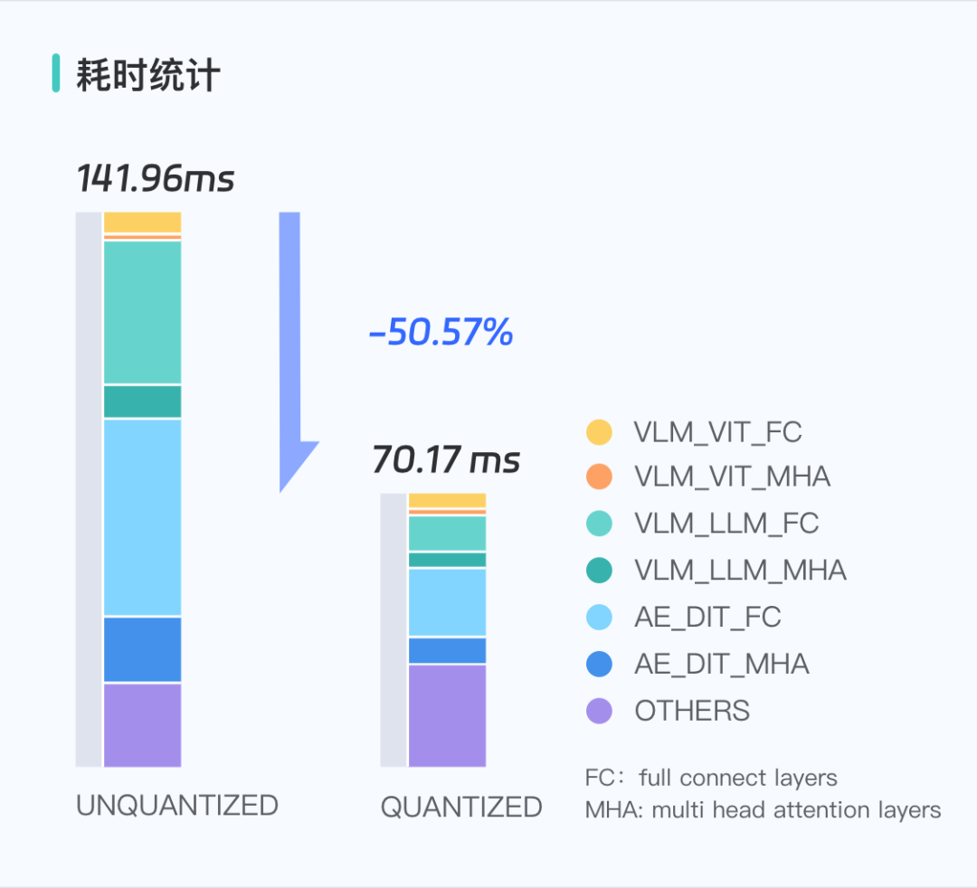 FP8/nvFP4低精度量化:針對π0.5模型中占計算耗時超85%的線性層與MHA層,開展低精度量化優(yōu)化,依托Jetson Thor低精度硬件加速實現(xiàn)性能躍遷,且MSE僅微增0.53%,完美平衡性能與精度;