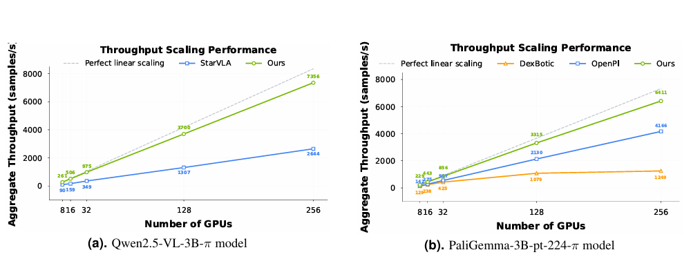 團隊開發(fā)了一套高度優(yōu)化的訓(xùn)練代碼庫。在8卡GPU集群上,這套代碼庫能實現(xiàn)單卡每秒261個樣本的吞吐量。相比現(xiàn)有的VLA專用代碼庫,訓(xùn)練速度提升了1.5-2.8倍。